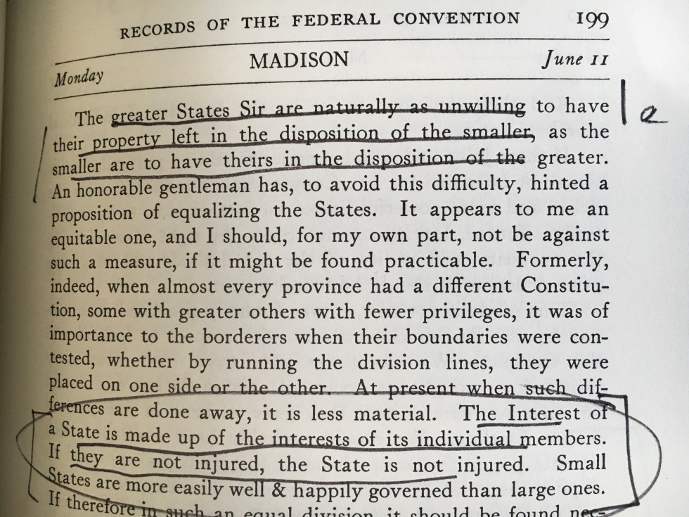 During the Constitutional Convention in 1787, Ben Franklin was concerned that giving states equal power regardless of their populations would allow a minority to rule a majority.