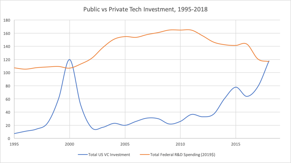 as not seen on tv, corporate intelligence by MaxSeptember 15, 20202:45 pmSeptember 15, 2020 Who funds innovation in the nominally capitalist US? The Federal govt increased its investment in R&D 700% b/w 1953 and 2018; and Federal R&D investment exceeded domestic private venture capital investment in 22 of last 23 years. For context , read this. Share this: Click to share on Reddit (Opens in new window) Reddit Click to share on Pinterest (Opens in new window) Pinterest Click to share on X (Opens in new window) X Click to share on Facebook (Opens in new window) Facebook Click to print (Opens in new window) Print More Click to share on LinkedIn (Opens in new window) LinkedIn Like Loading... Related