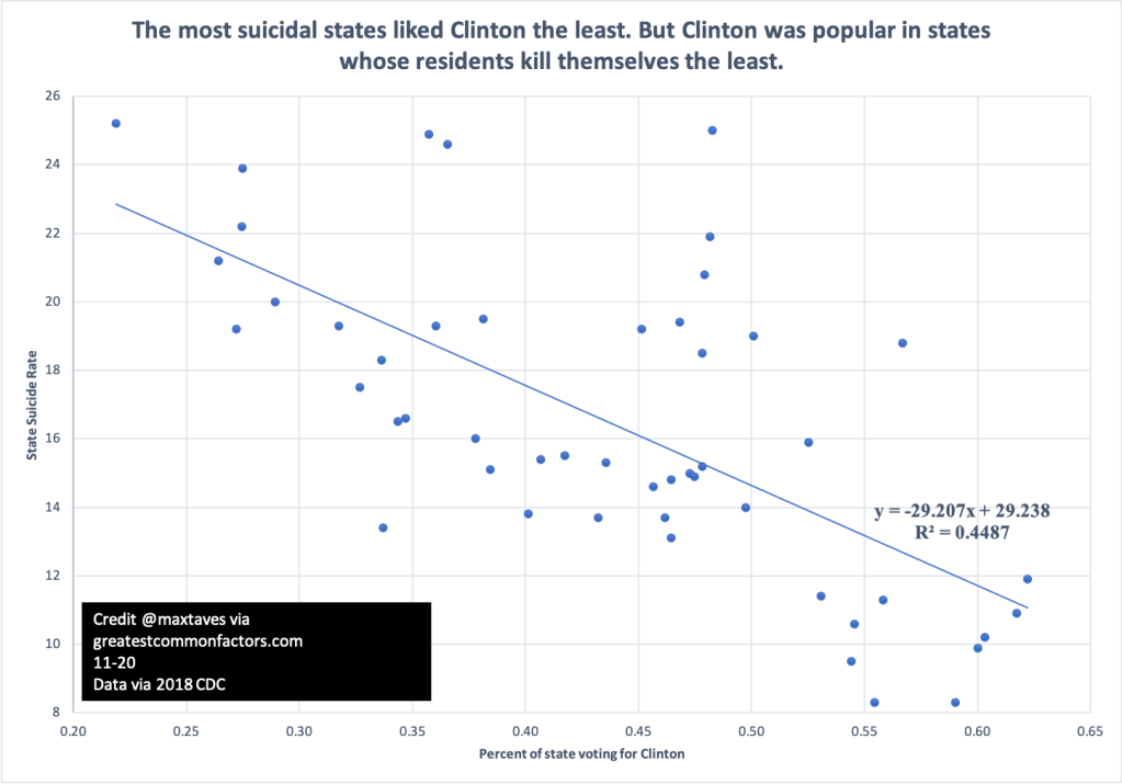as not seen on tv by MaxNovember 13, 20205:41 pm States with high suicide rates don’t like democrats… Exhibit 1. Share this: Click to share on Reddit (Opens in new window) Reddit Click to share on Pinterest (Opens in new window) Pinterest Click to share on X (Opens in new window) X Click to share on Facebook (Opens in new window) Facebook Click to print (Opens in new window) Print More Click to share on LinkedIn (Opens in new window) LinkedIn Like Loading... Related