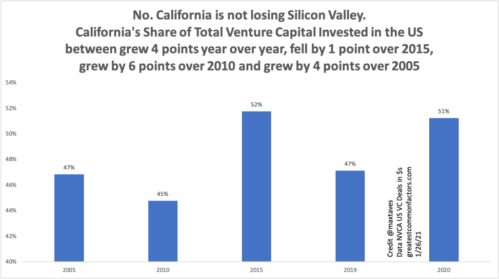 California has attracted more than 50% of the trillion-plus dollars invested in the last 15 years (see chart above); and far from losing its dominance in tech in 2020, California’s share of total US venture capital investment rose to its second-highest level in 15 years of data.